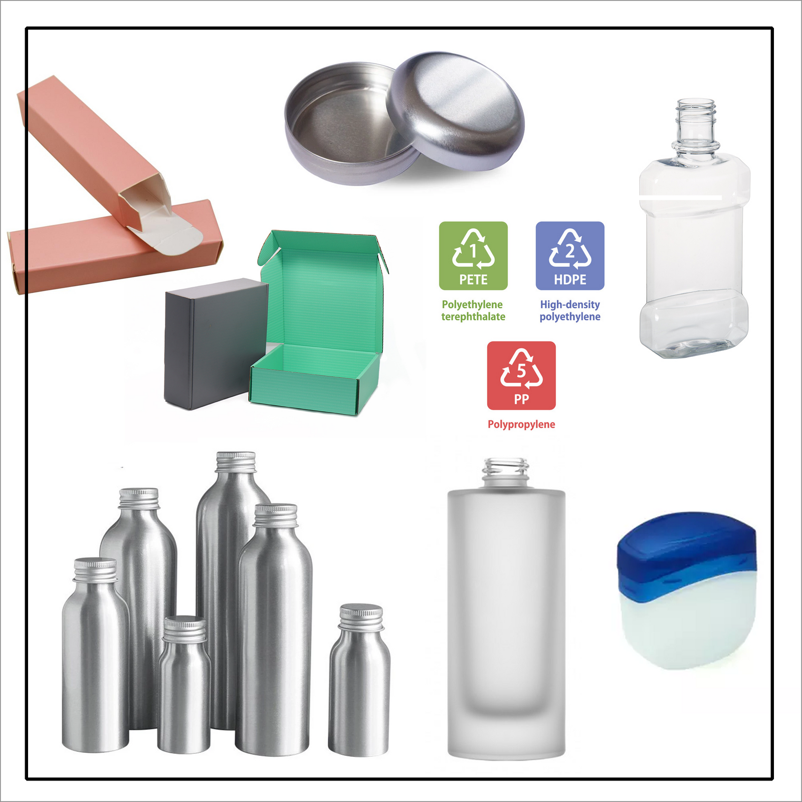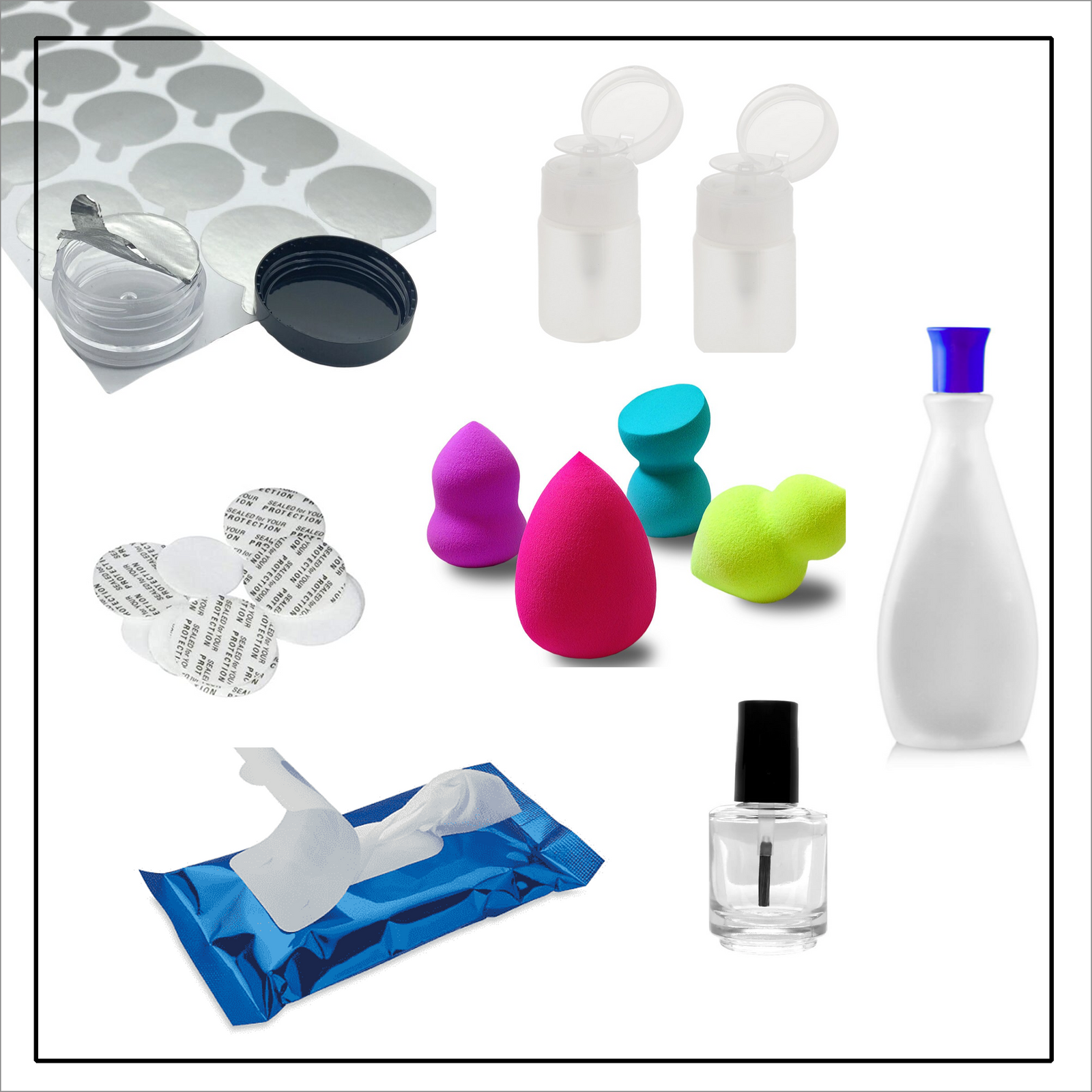 + Plastic jars/pots, tubes, sticks, and small (e.g. travel size) bottles